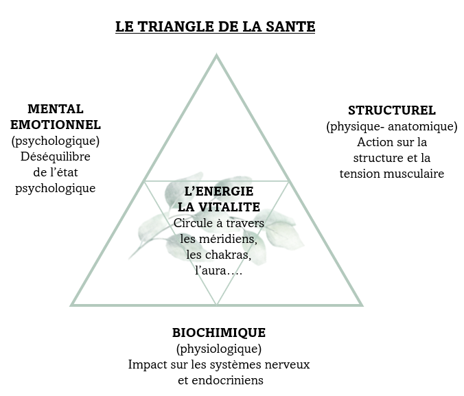 1-Une alliance de techniques douces qui prennent en compte l'être dans sa globalité (cf triangle de la santé) permettant une meilleure compréhension et acceptation de soi.